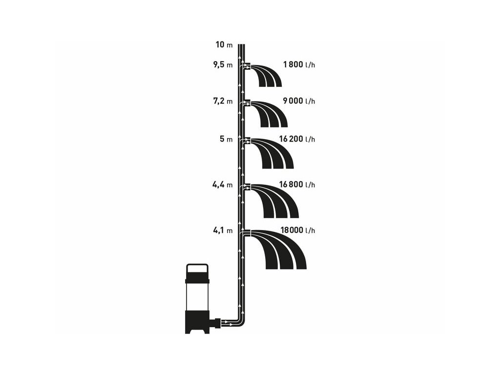 - Vysoká účinnosť: Silný motor a vysoký prepravný objem umožňujú rýchle a efektívne čerpanie vody aj s pevnými nečistotami.