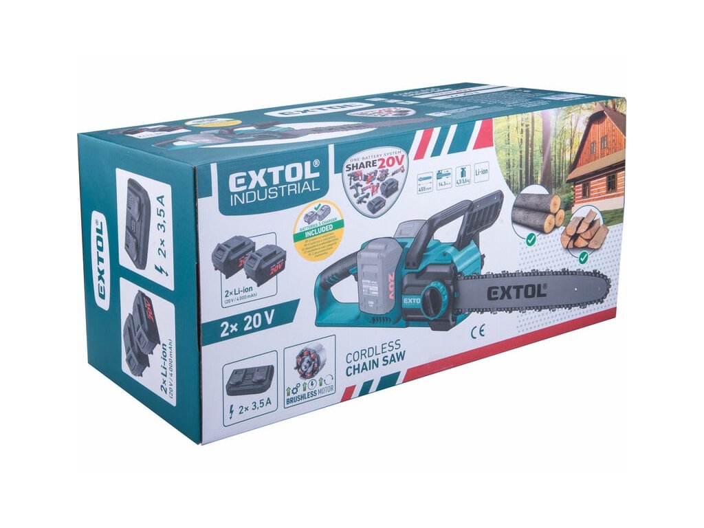 Píla reťazová Share20V, 2x 4Ah, čepeľ 455mm, bezuhlíkový motor, EXTOL INDUSTRIAL