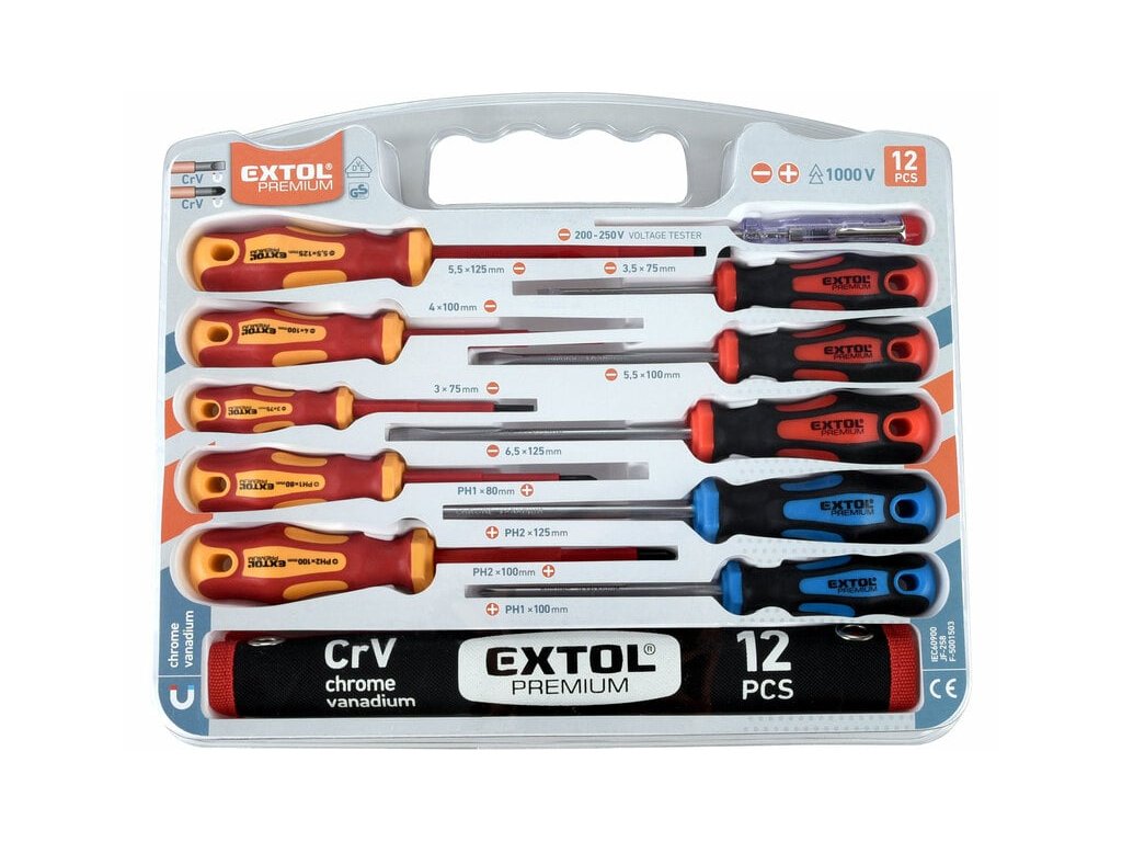 | doplňujúci parameter: | 12-dielna sada, (-)3,5x75mm-5,5x100mm-6,5x125mm, (+)PH1x100mm-PH2x125mm, izolované VDE 1000V (-)3,5x75mm-4x100mm-5,5x125mm, (+)P |