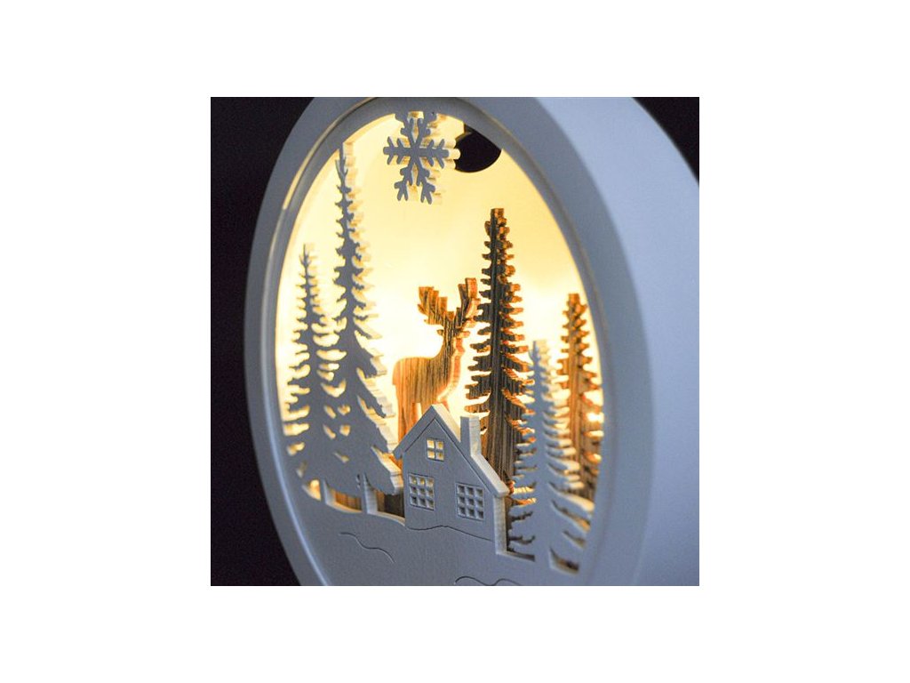 Minimalistická LED dekorácia v kombinácii bielej farby a prírodného dreva zobrazuje zimnú lesnú scénu s jeleňmi a stromami. Vo vnútri sa nachádzajú 4 LED diódy s teplým bielym svetlom, ktoré navodzujú príjemnú večernú atmosféru. Vďaka kompaktným rozmerom 14 × 14 × 2,5 cm je dekorácia ideálna na zavesenie na stenu, do okna alebo ako dekorácia na poličku.