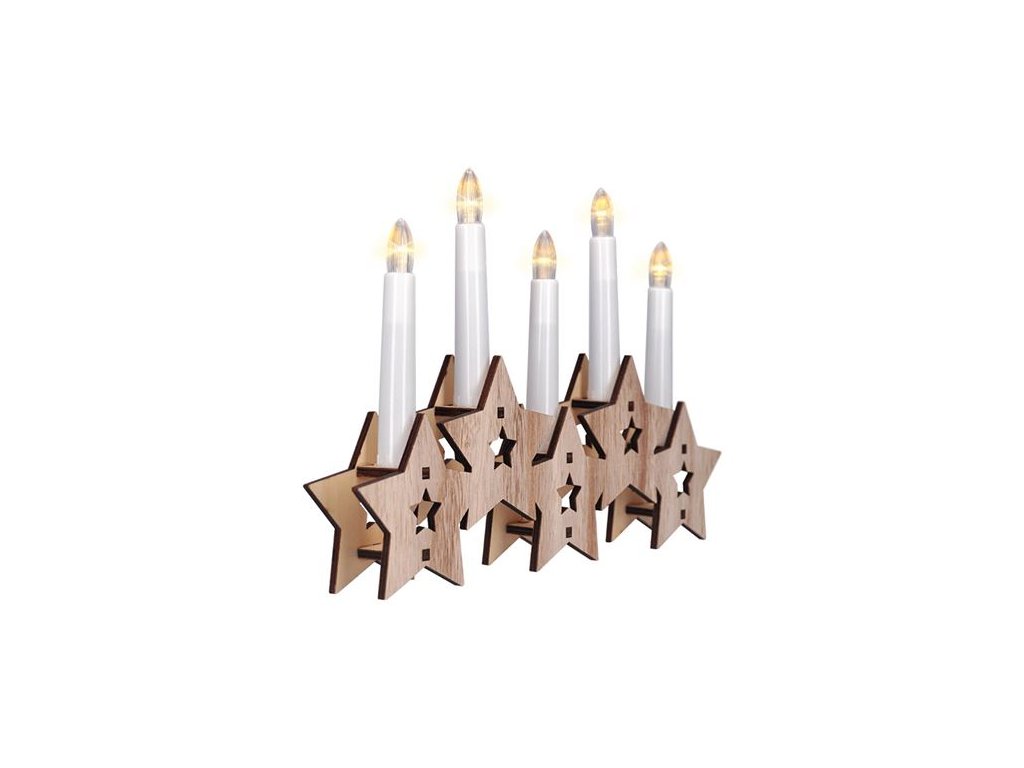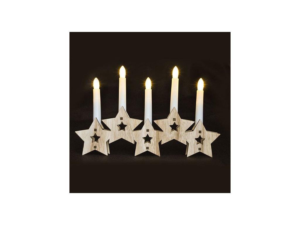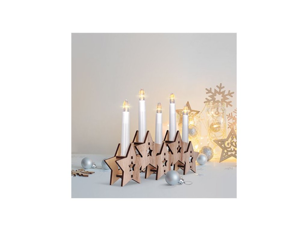 Drevený svietnik s piatimi sviečkami a LED diódami v teplej bielej farbe je štýlovou reinterpretáciou klasického adventného svietnika. Je vyrobený z prírodného dreva a spája tradičný vzhľad s modernou technológiou. Dekor hviezdičiek dodáva svietniku šmrnc a zároveň jemnú eleganciu. Vďaka rozmerom 30 × 20 × 3,5 cm je dominantnou ozdobou na parapete alebo komode.