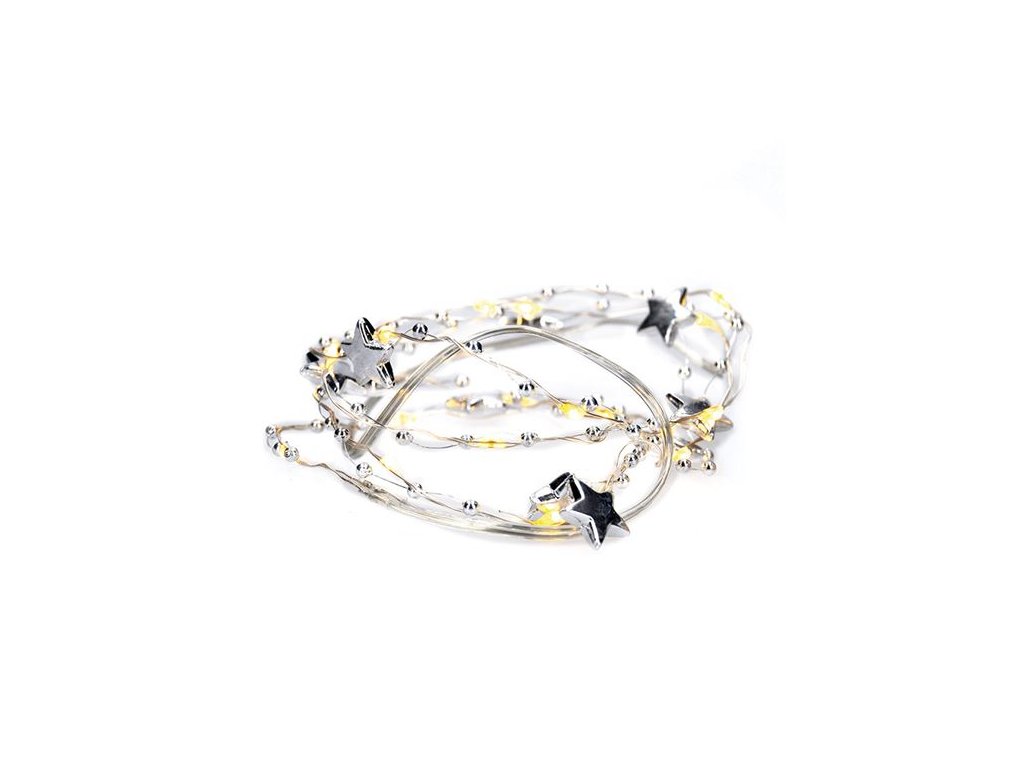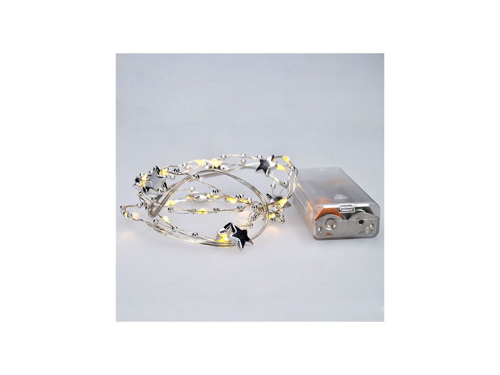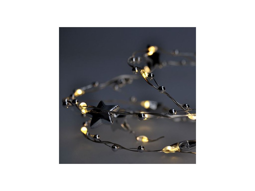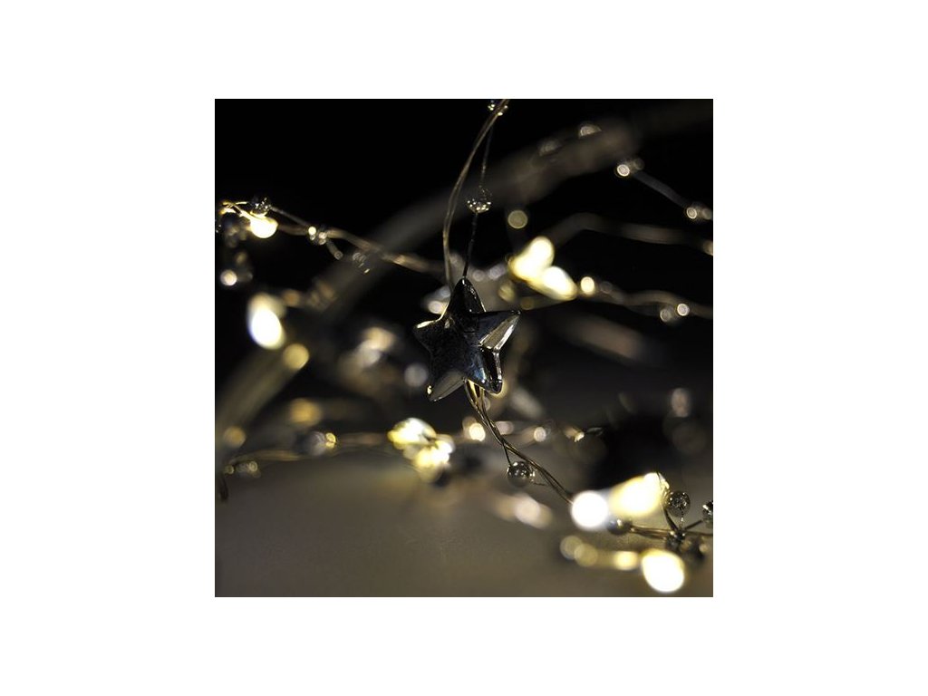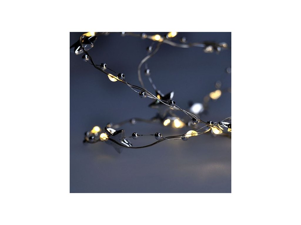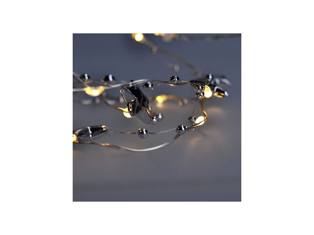 Kompaktná LED reťaz s 20 LED diódami a dekoráciami je ideálna na malé svetelné akcenty v interiéri. S dĺžkou 1 meter a jemným teplým bielym svetlom je skvelým doplnkom na poličky, vianočné aranžmány, kvety alebo do detských izieb. Strieborná šnúra dodáva moderný nádych a dá sa ľahko skryť medzi dekorácie.