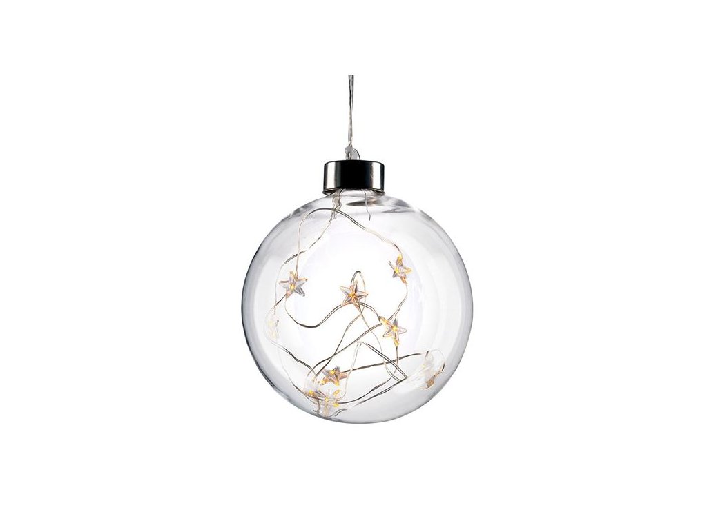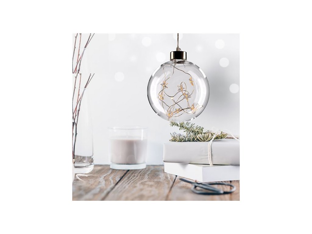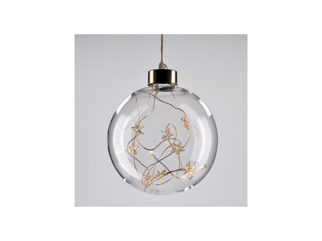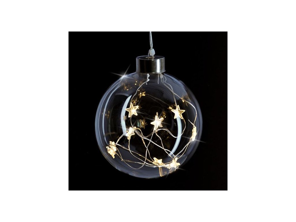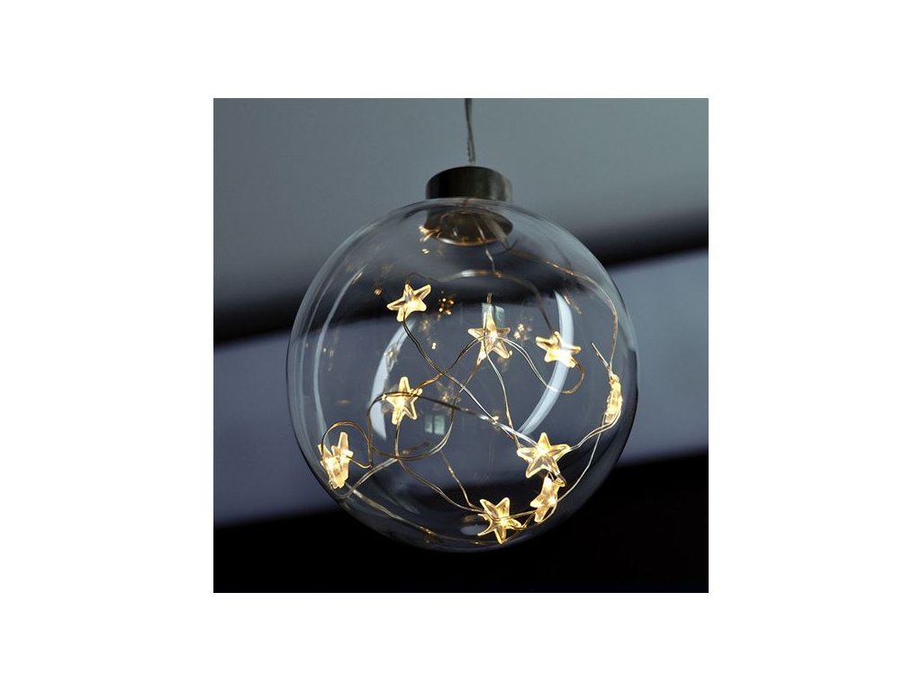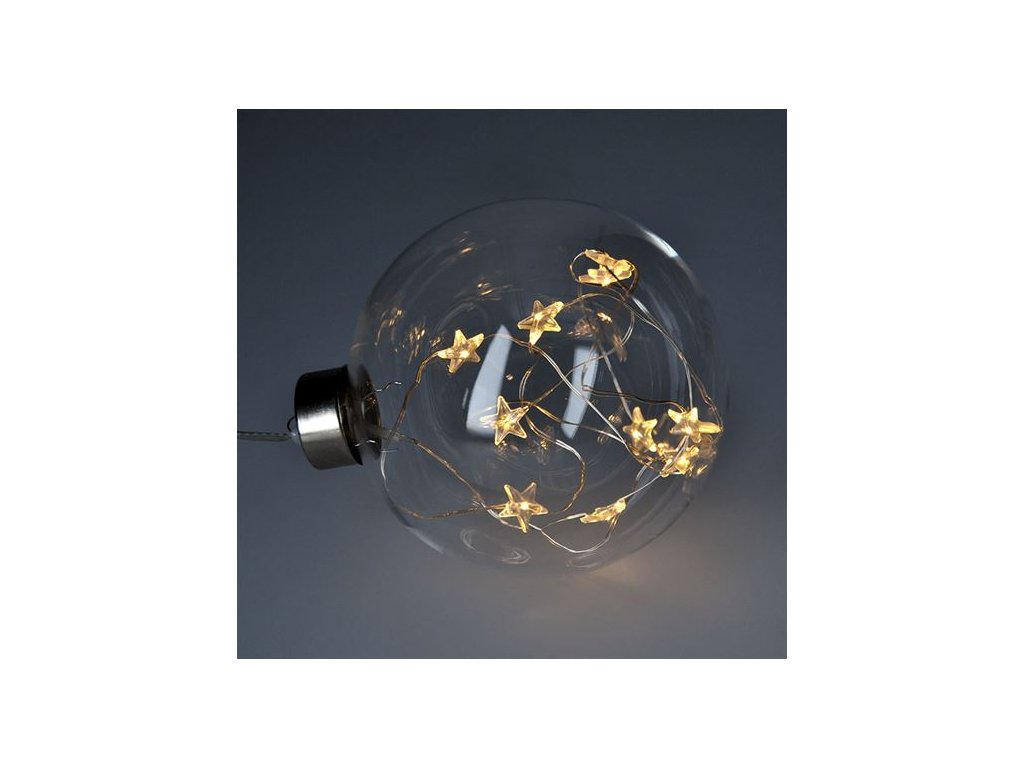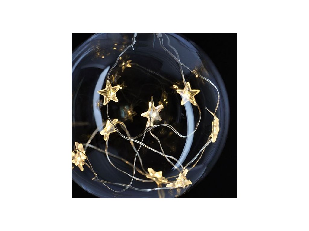 Elegantná sklenená vianočná guľa s reťazou LED vo vnútri vyniká čistým, dekoratívnym vzhľadom a mäkkým teplým bielym svetlom. Vo vnútri gule s priemerom 10 cm sa nachádza 10 LED diód, ktoré vytvárajú efekt malého svetelného vesmíru. Guľa je zavesená na 50 cm napájacom kábli, takže je vhodná na zavesenie do okna, na strop alebo na dekoratívne vetvy.