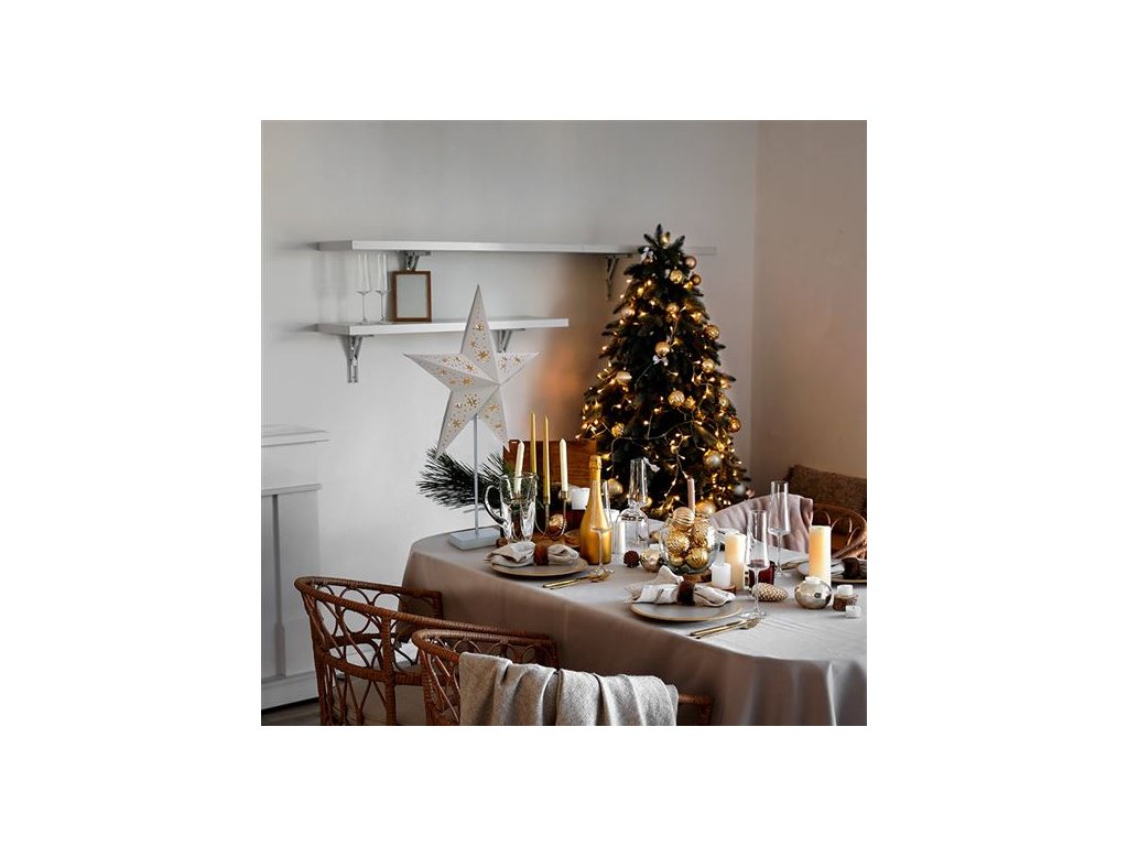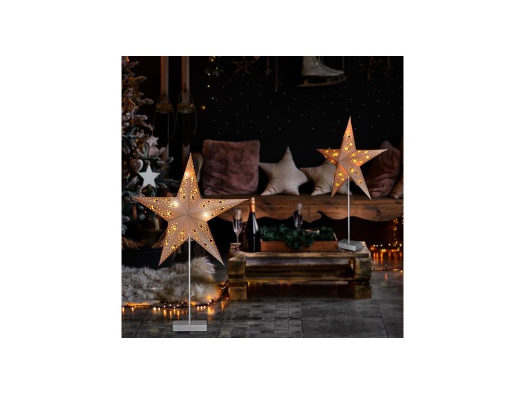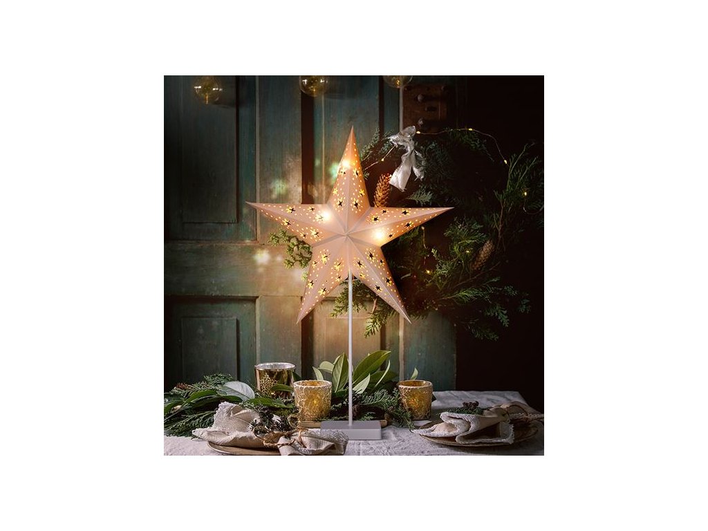 Táto elegantná poinsettia so stojanom vnesie do interiéru nádych noblesy a pokoja. S priemerom 45 cm a celkovou výškou 66 cm sa stane výraznou dominantou na stole, komode alebo parapete. Vo vnútri papierovej hviezdy je integrovaná reťaz s 10 LED diódami, ktoré vyžarujú teplé biele svetlo a vytvárajú príjemnú, mäkkú atmosféru. Biela farba hviezdy zdôrazňuje jemnosť dizajnu a výborne sa kombinuje s ostatnými vianočnými dekoráciami.