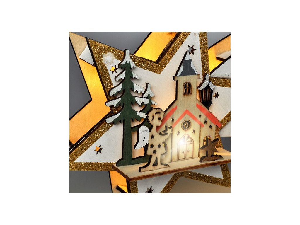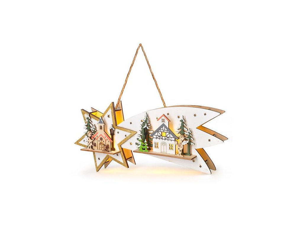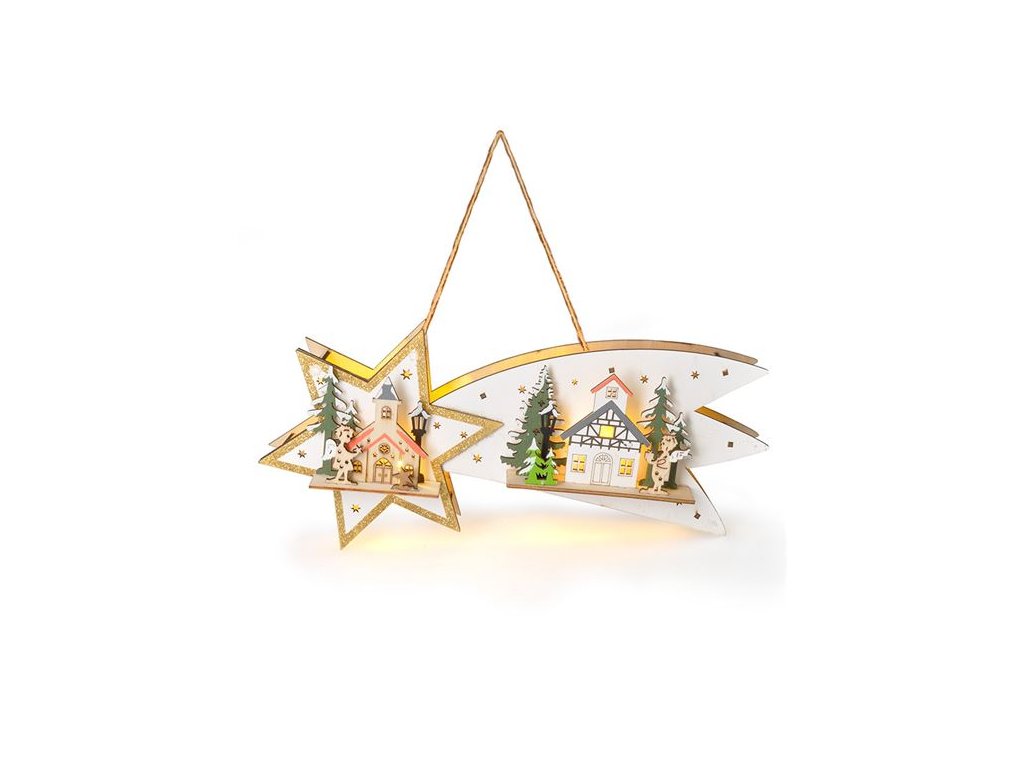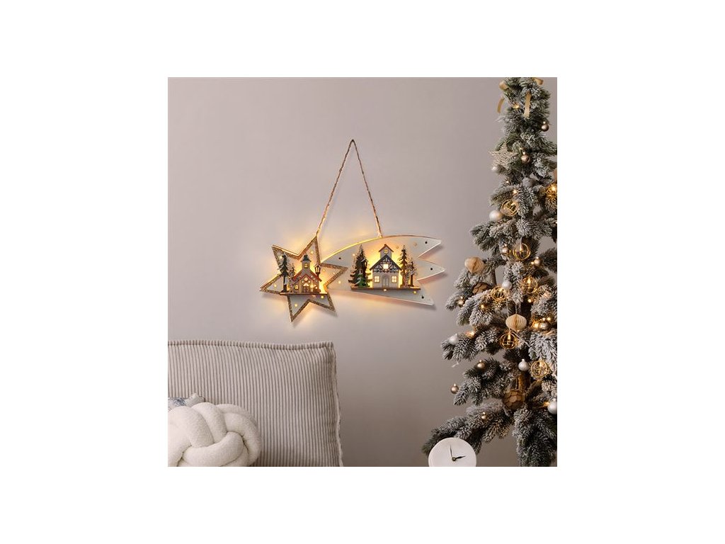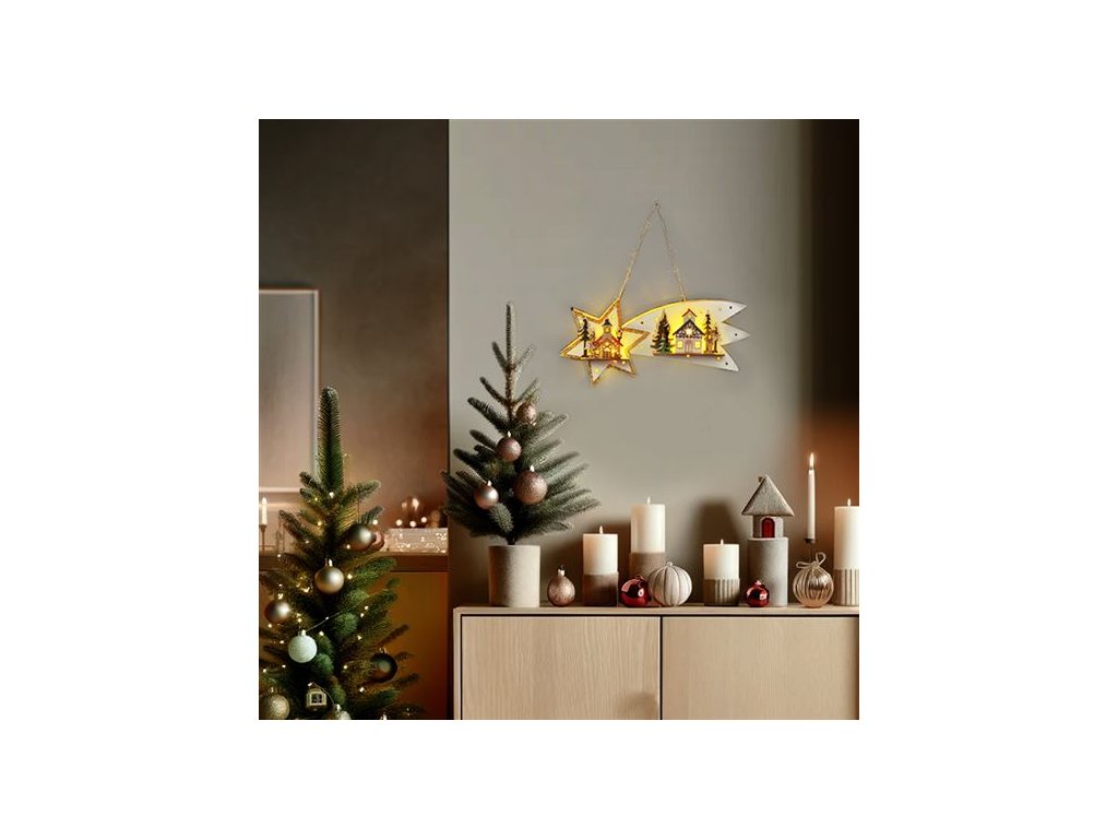 Elegantná drevená dekorácia v tvare vianočnej kométy s 10 LED diódami krásne doplní vašu zimnú výzdobu. Teplé biele svetlo osvetľuje celý tvar kométy a vytvára efekt padajúcej hviezdy. Vďaka rozmerom 31 × 6 × 14 cm a praktickému závesnému pútku ju ľahko umiestnite na dvere, stenu alebo okenný rám.