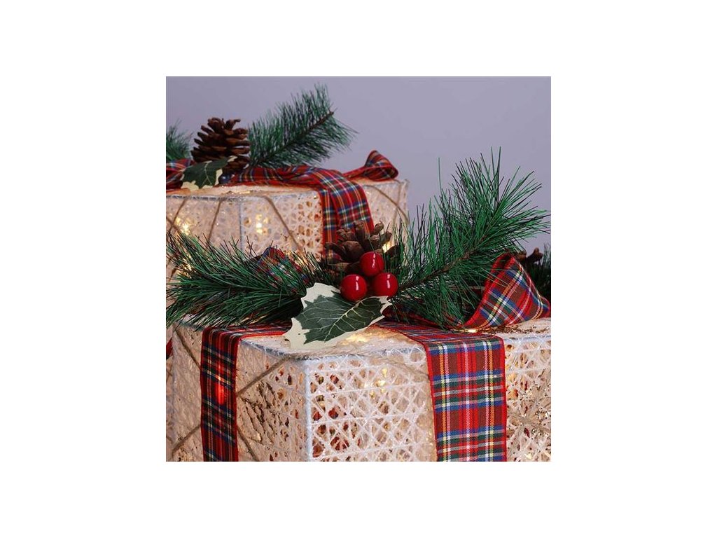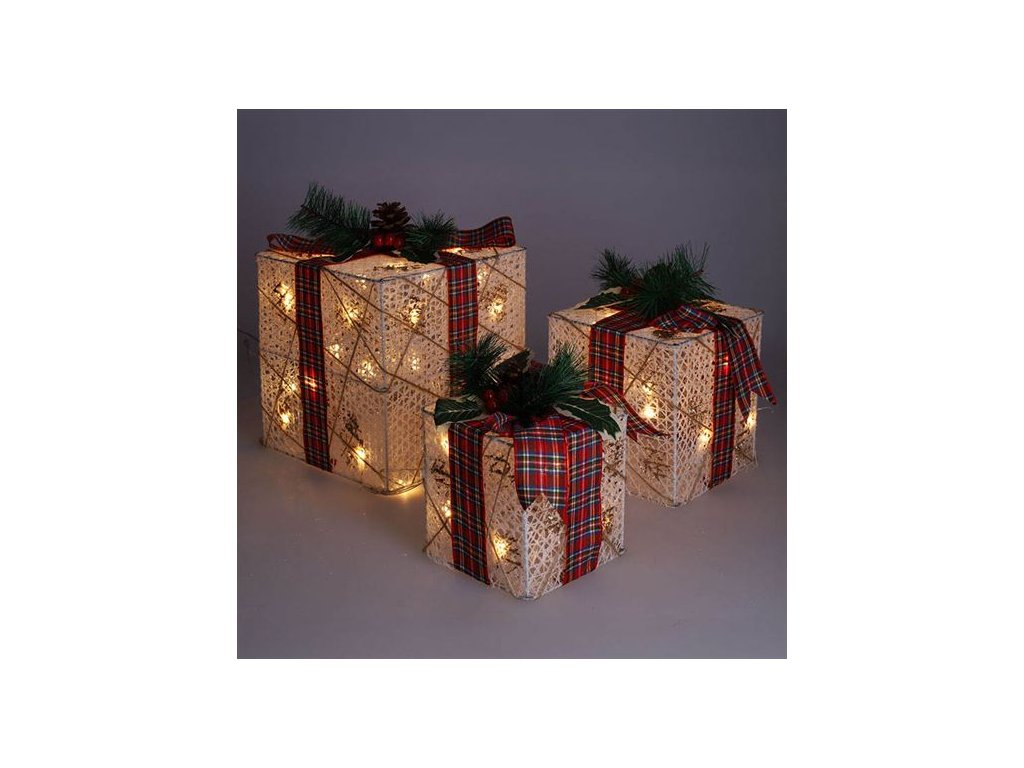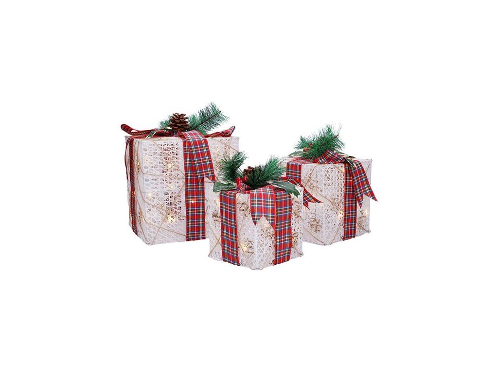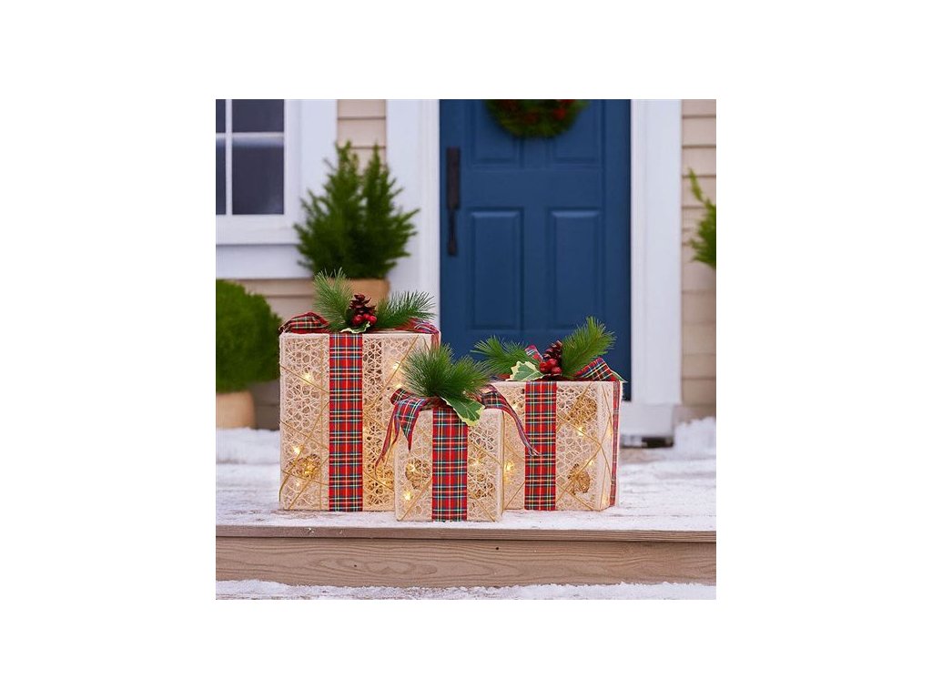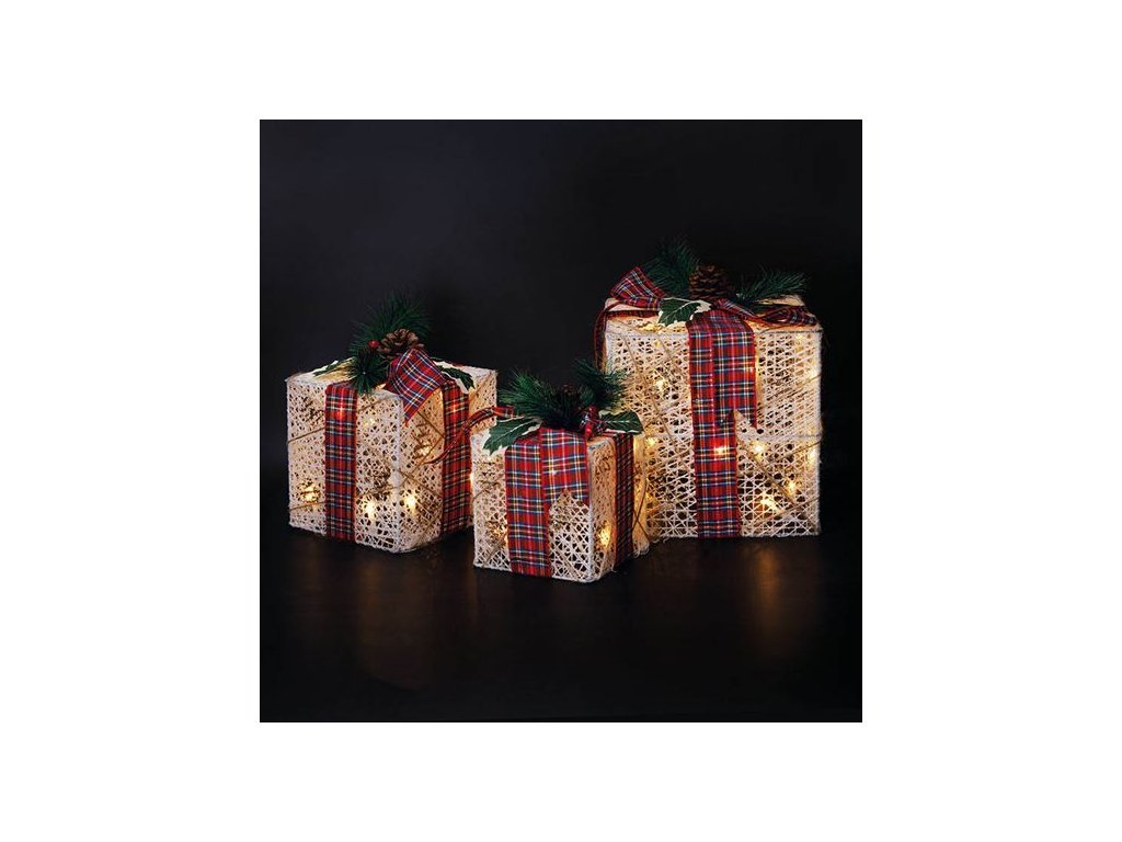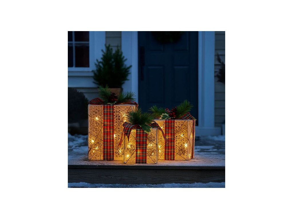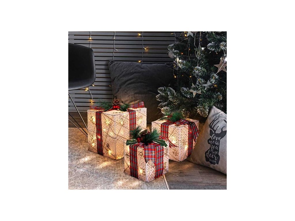 Sada obsahuje tri darčeky rôznych veľkostí (20 cm, 15 cm a 12 cm), ktoré sú osvetlené 48 LED diódami v teplej bielej farbe. Vďaka praktickému časovaču sa svetlá automaticky zapnú na 6 hodín a potom sa na 18 hodín vypnú, čo zaisťuje pohodlné a energeticky úsporné používanie.